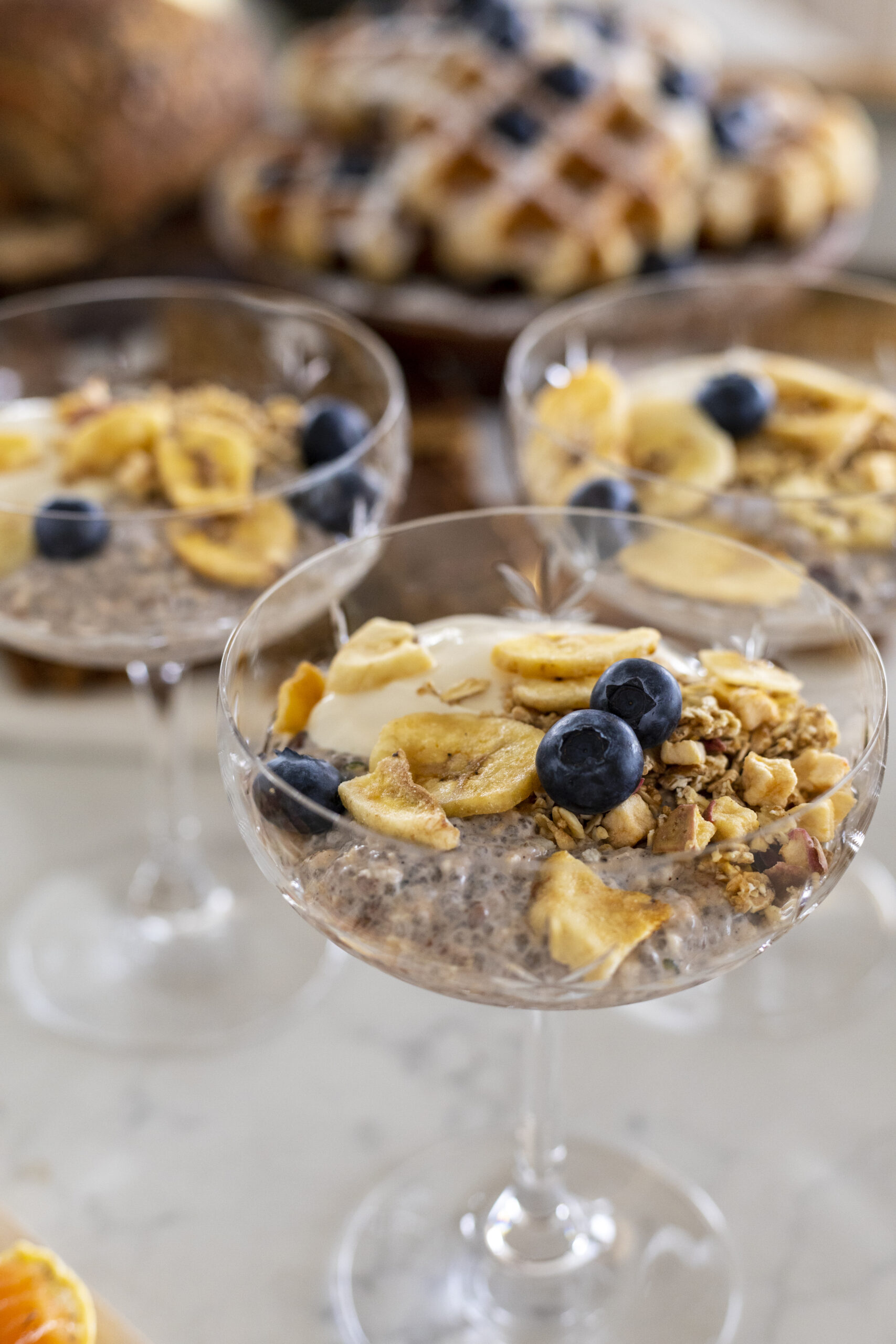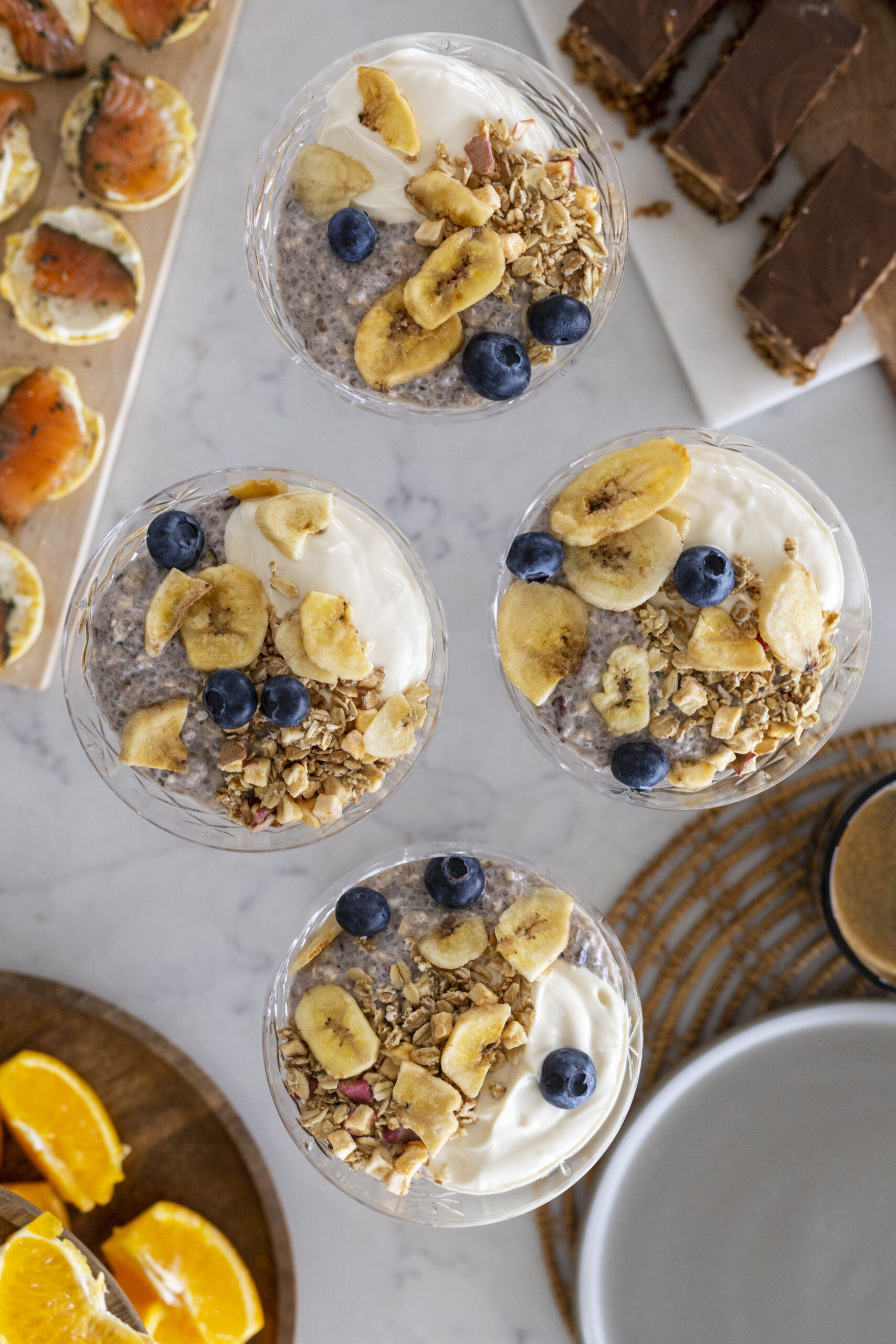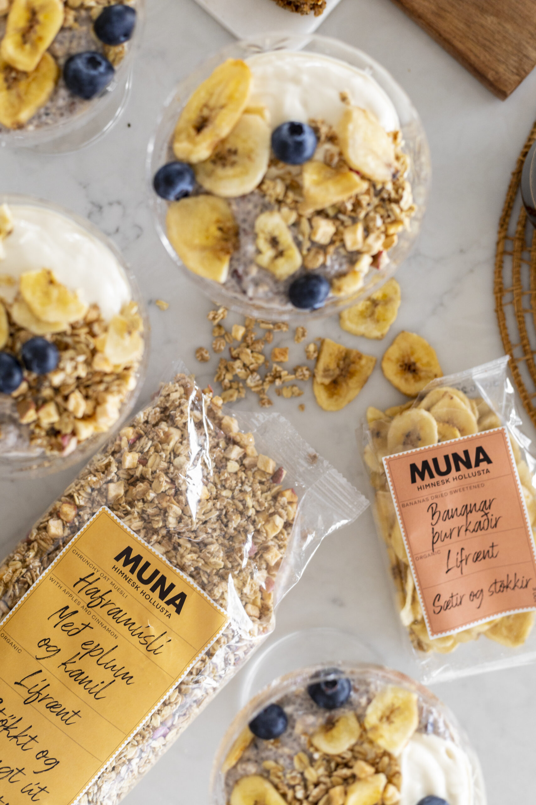 • Bætið grískri jógúrt út á ásamt haframúslíi, þurrkuðu bönunm og bláberjum.