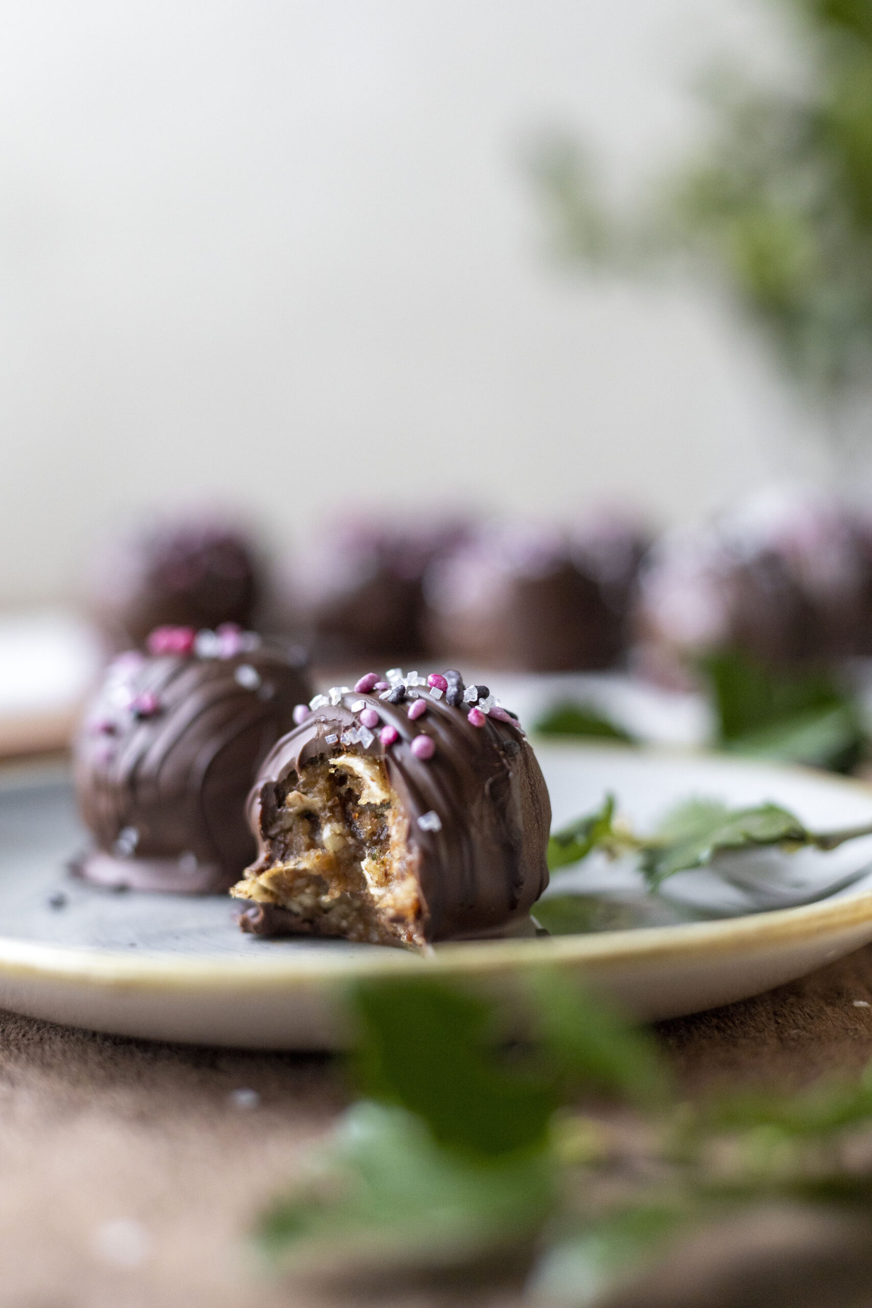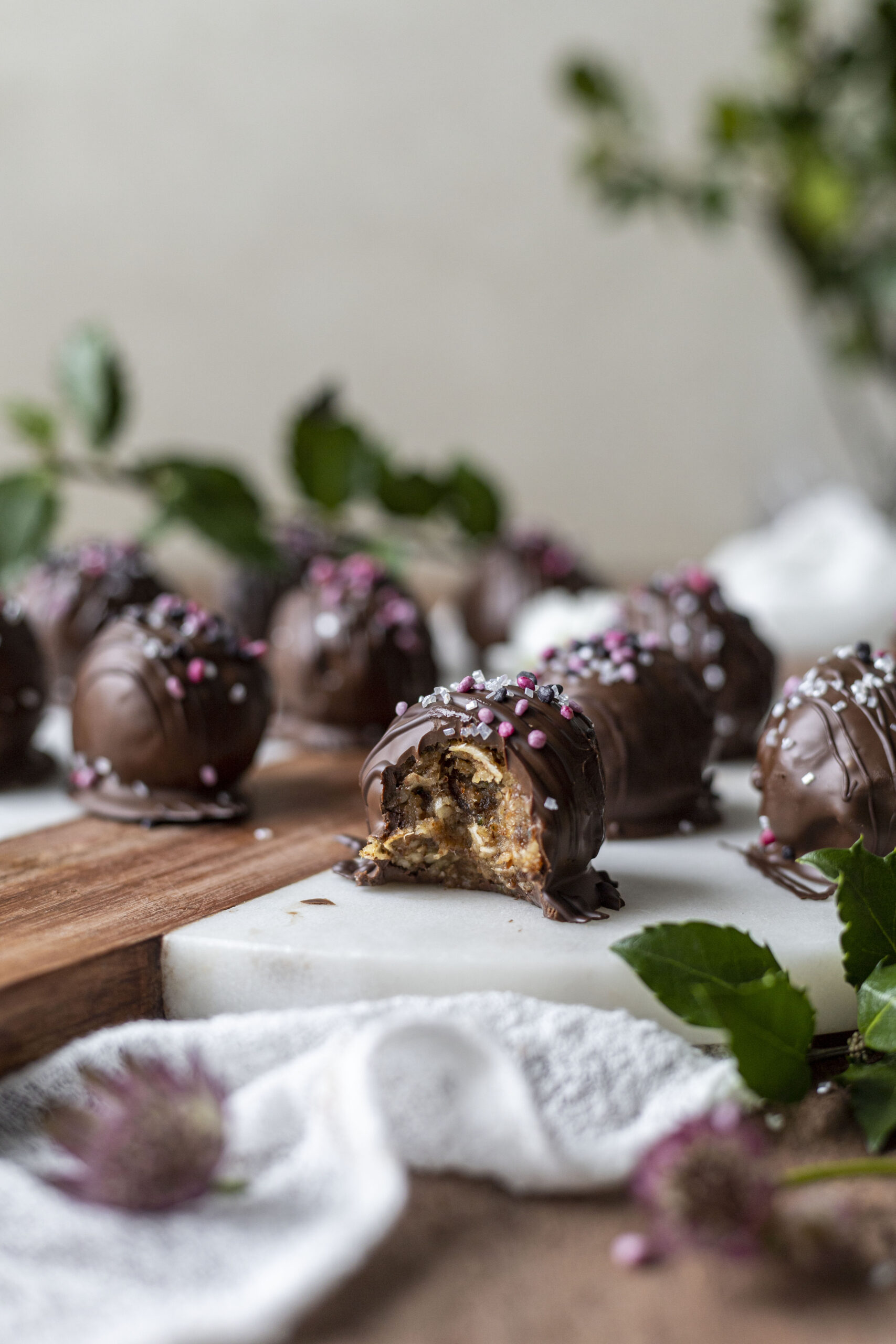 Það er afar einfalt að smella þeim saman og það tekur mjög stutta stund. Maður byrjar á því að leggja döðlurnar örstutt í bleyti í heitu vatni. Á meðan döplurnar eru að mýkjast græjar maður restina. Hakkar möndlurnar og setur restina af innihaldsefnunum í skálina. Svo maukar maður döðlurnar og blandar öllu saman. Hnoðar svo kúlur úr deiginu og hjúpar þær svo með súkkulaði.
