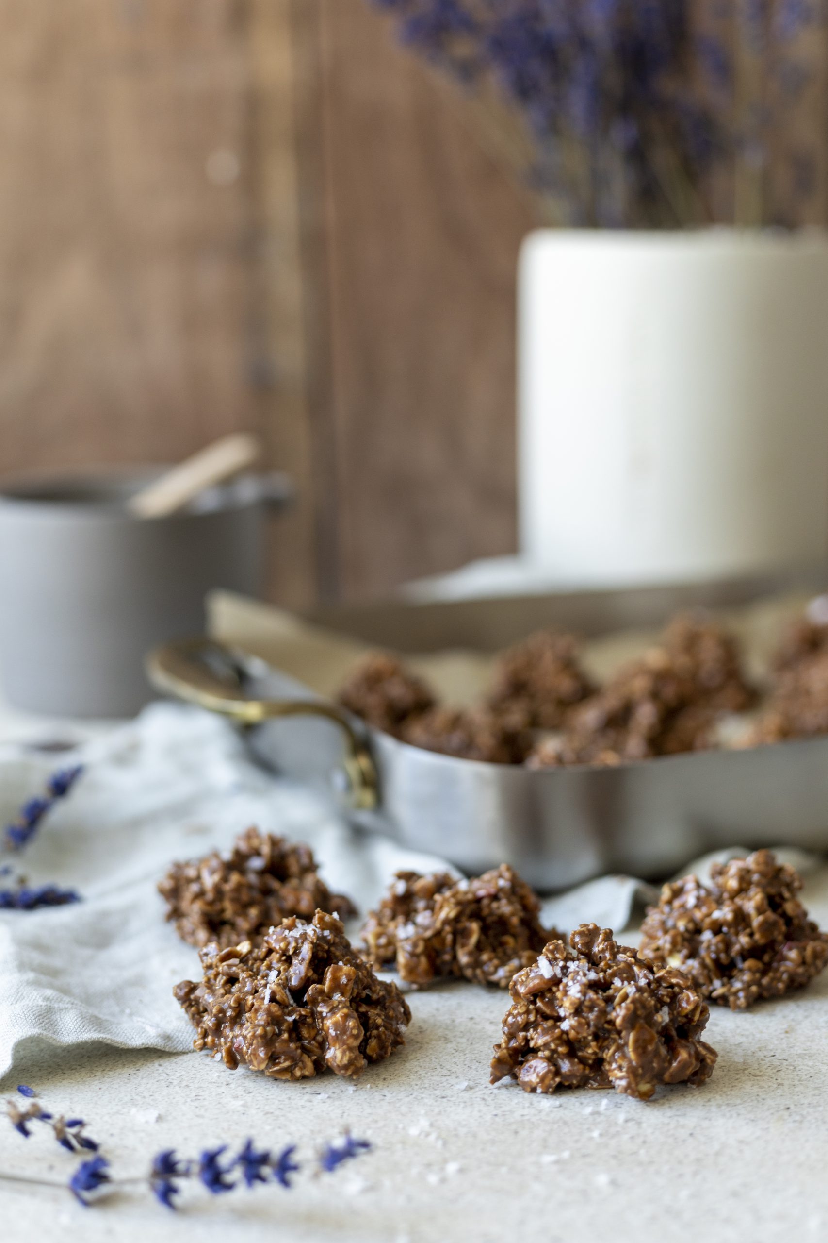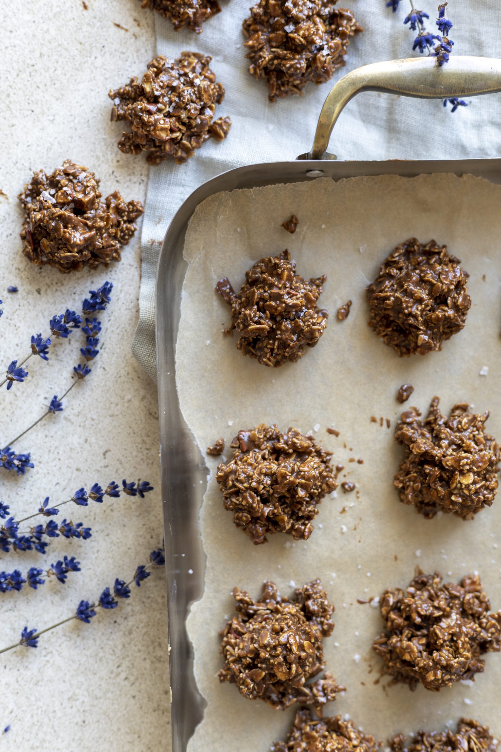 - Setjið smjörpappír á disk eða ofnskúffu (ef hún kemst í frystinn) og útbúið kökur úr 2 tsk af deigi og setjið á smjörpappírinn, setjið í frystinn í amk klst eða þar til kökurnar hafa stirðnað. Sáldrið örlitlu sjávarsalti yfir.