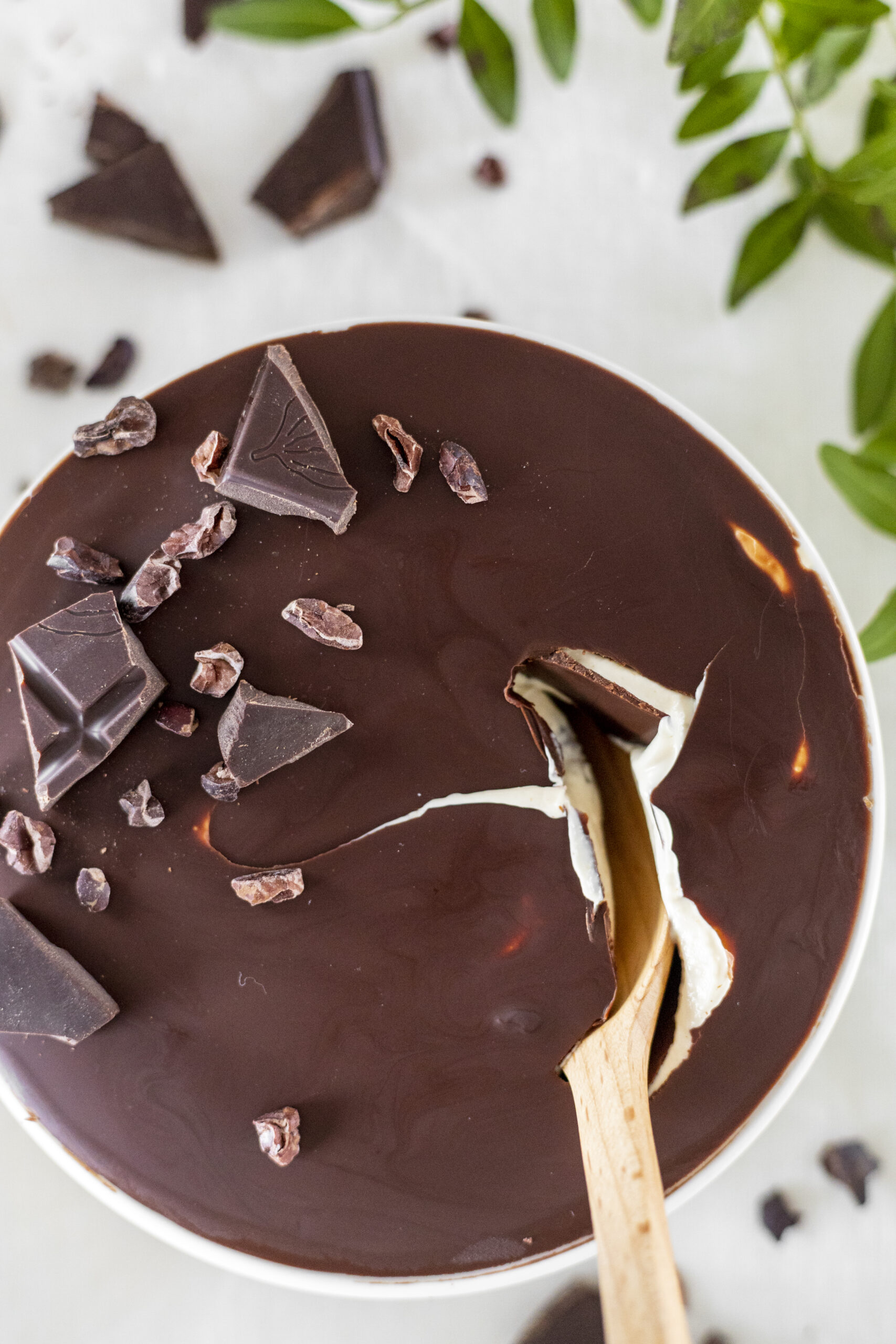 - Setjið kókosolíu og dökkt súkkulaði í skál sem má fara inn í örbylgju. Bræðið saman með því að setja inn í örbylgjuofninn u.þ.b. 30 sek í einu og hrærið vel á milli, hitið þar til bráðnað. Hellið varlega yfir jógúrt lagið og sléttið varlega úr. Setjið aftur inn í ísskáp og geymið í a.m.k. 30 mín.
