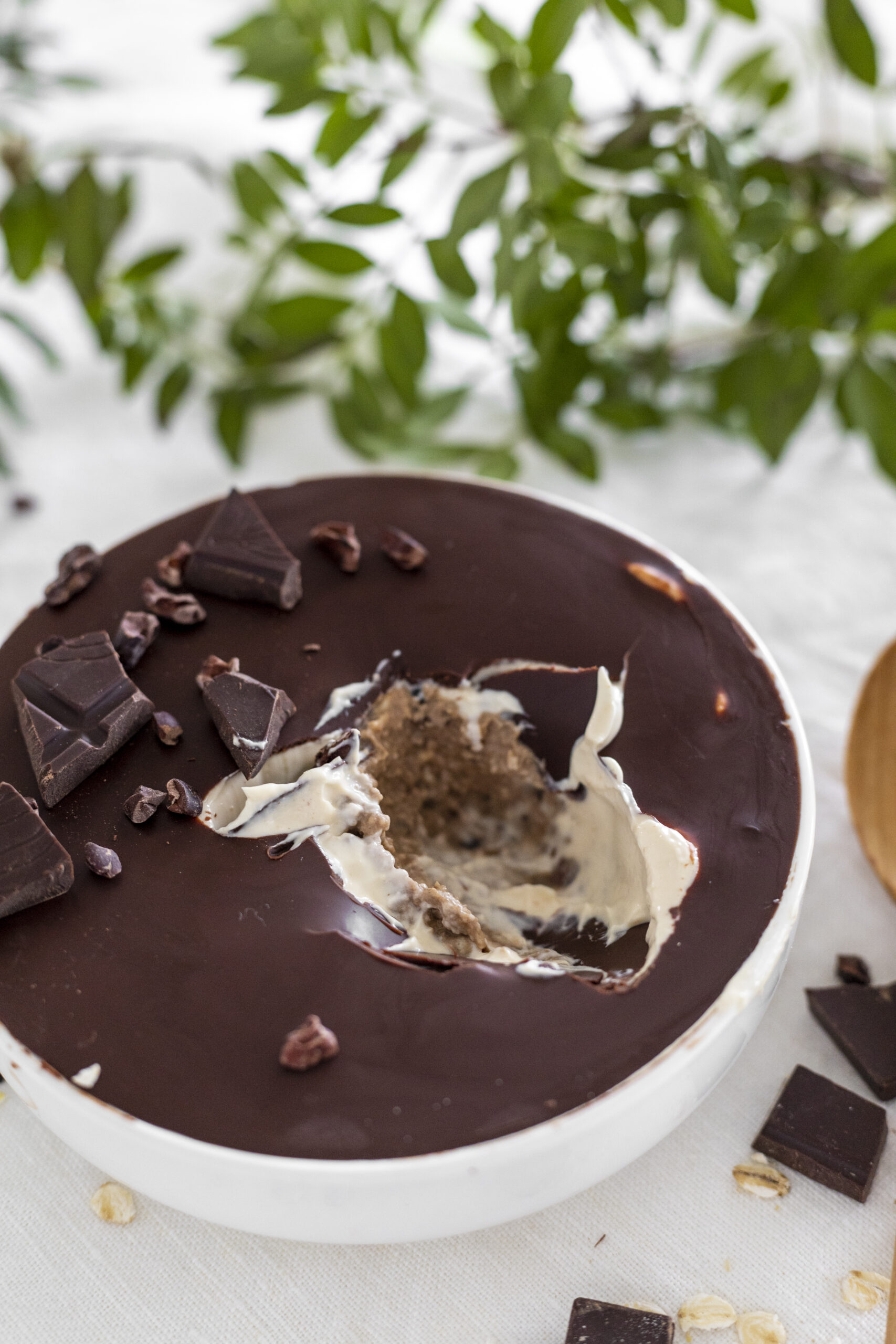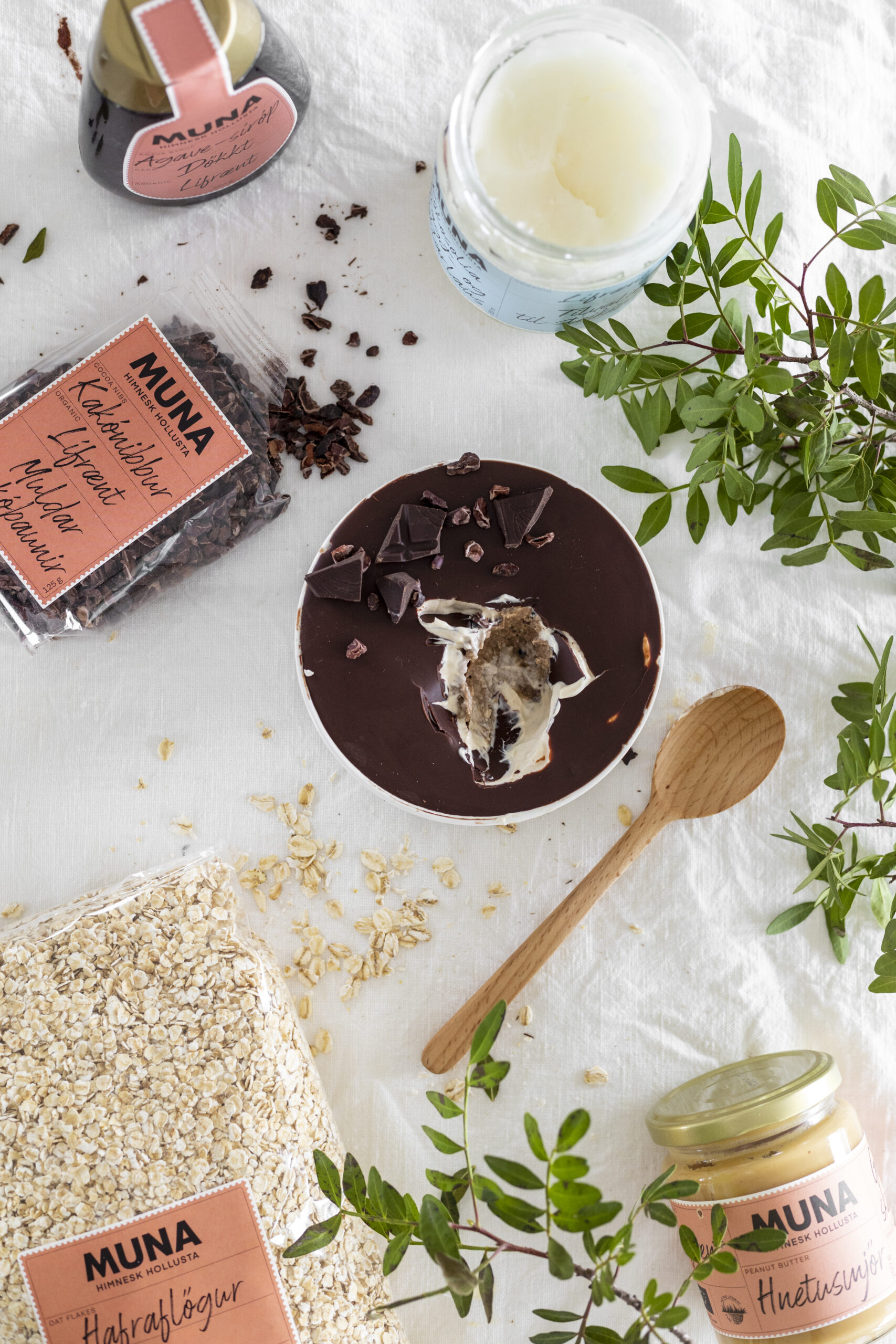 Hann er líka miklu einfaldari en hann lítur út fyrir að vera. Maður einfaldlega mylur hafra og blandar saman við súkkulaði prótein, möndlumjólk og kakónibbur. Því næst blandar maður saman grískri jógúrt, hnetusmjöri og örlitlu agave sírópi. Svo toppar maður grautinn með bræddu dökku súkkulaði og kókosolíu.